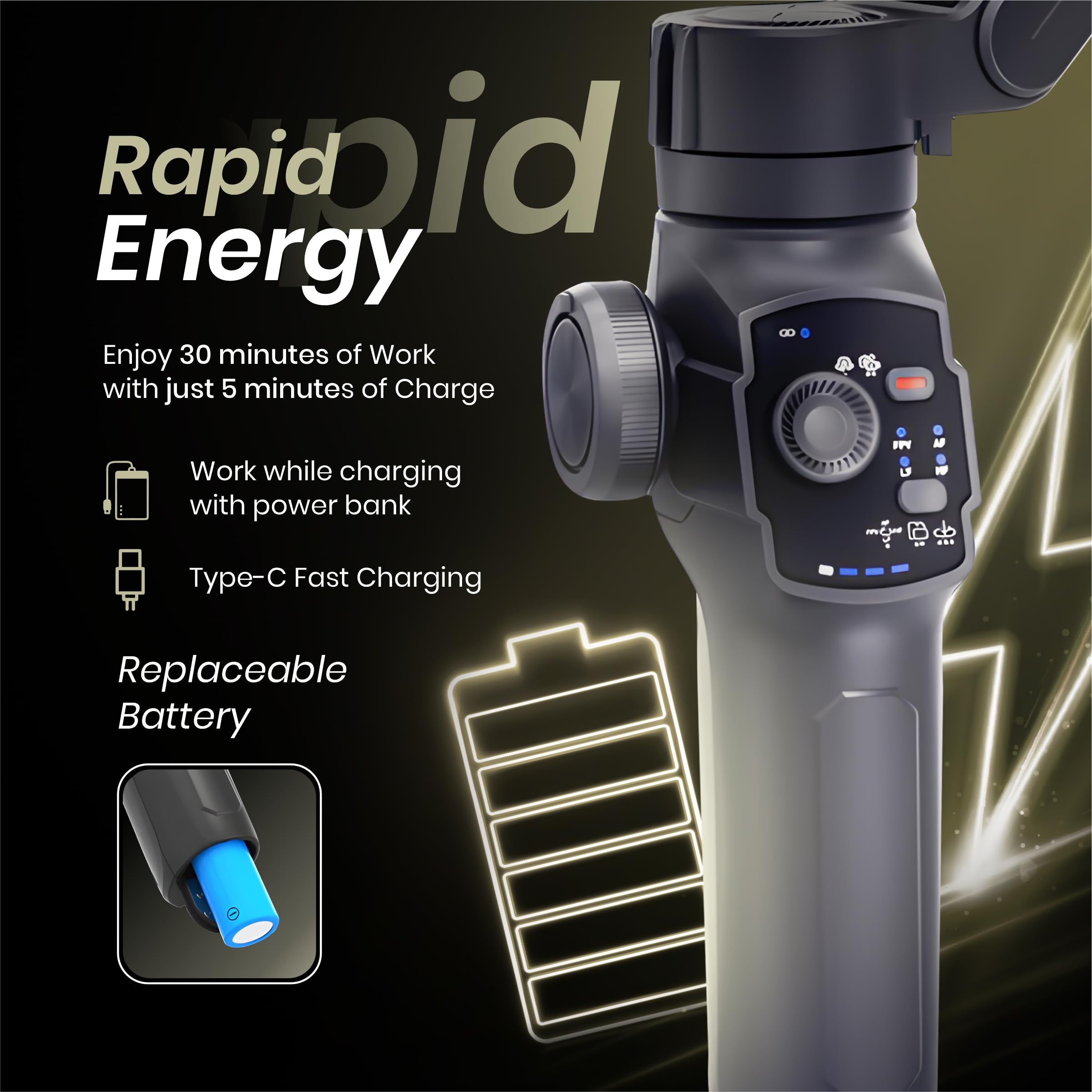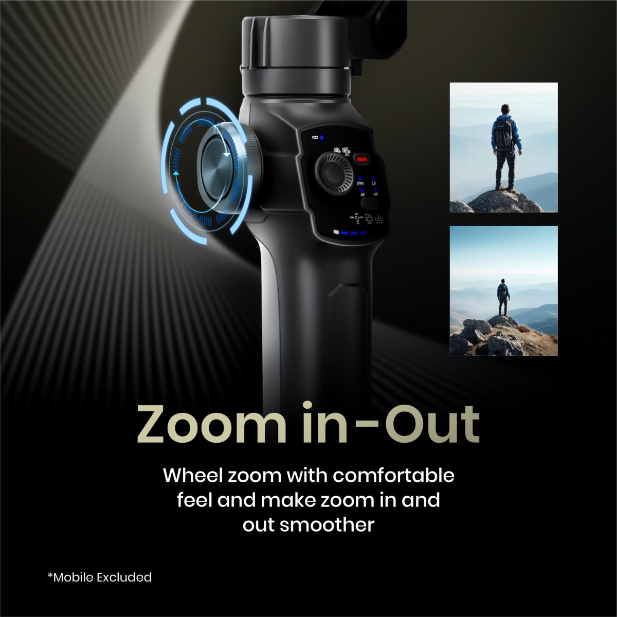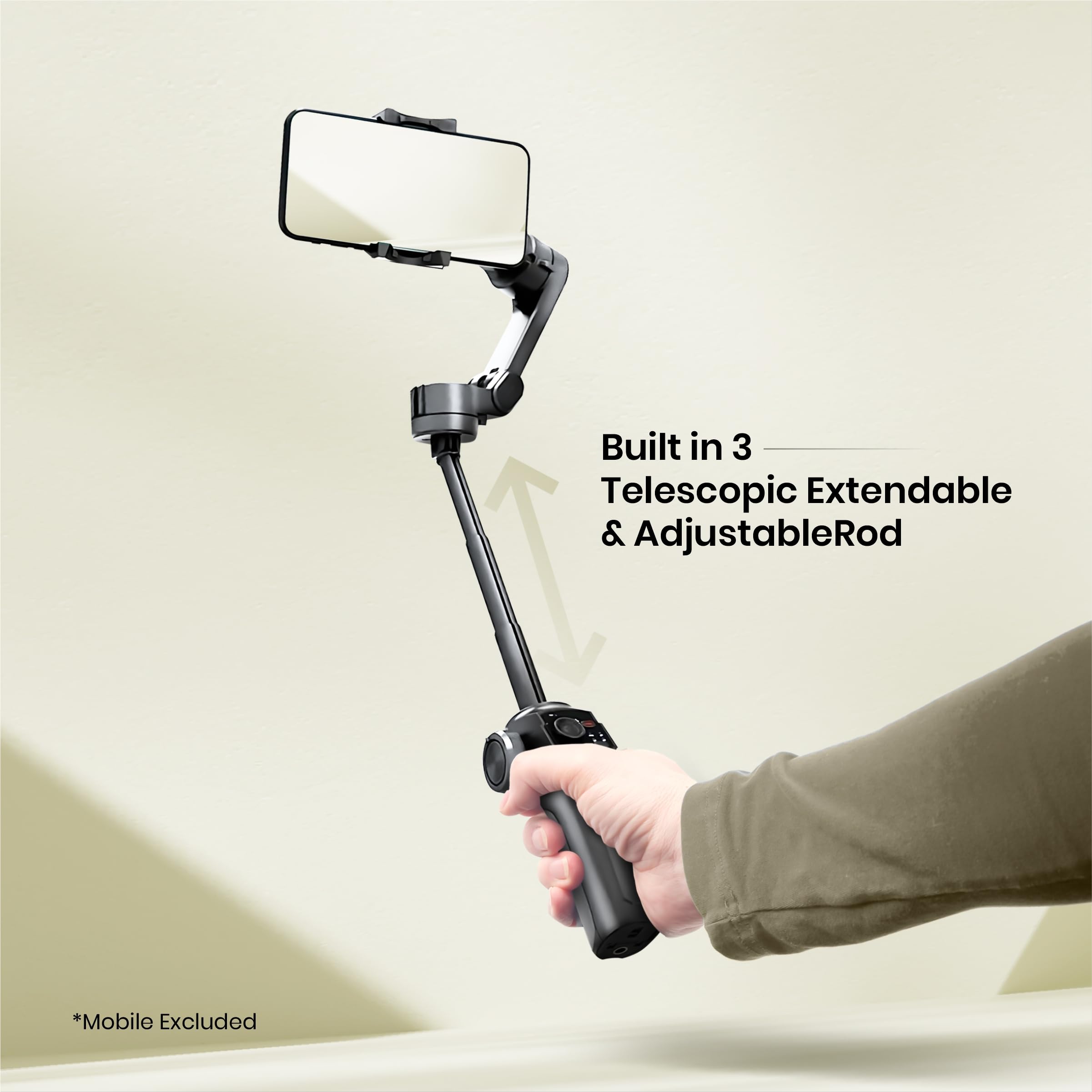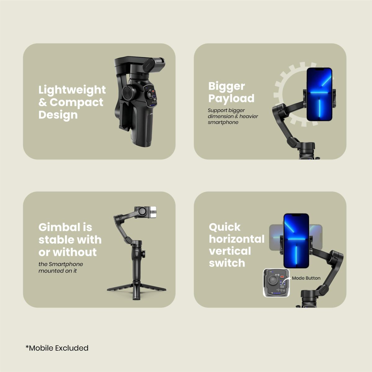 - A 3-Axis Gimbal stabilizes the camera for smooth video on the move. Can do Portrait / Horizontal & Low Angle to shoot
