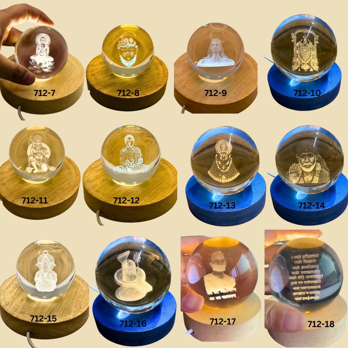 • 12 Intricately Laser-Engraved Spiritual Designs Choose from a collection of sacred 3D laser-engraved designs inside a 60mm crystal ball. Options include Lord Shiva, Shiv Ling, Lord Ganesha, Shree Nathji, Shree Sai Baba, Khatu Shyamji, Lord Hanuman, Tirupati Balaji, Acharya Mahashraman, Namokar Mantra (in graphic or letter form), and Bhagwan Mahavir with Acharyas. Available as the crystal ball only, with an LED wooden base, or as a base-only option.