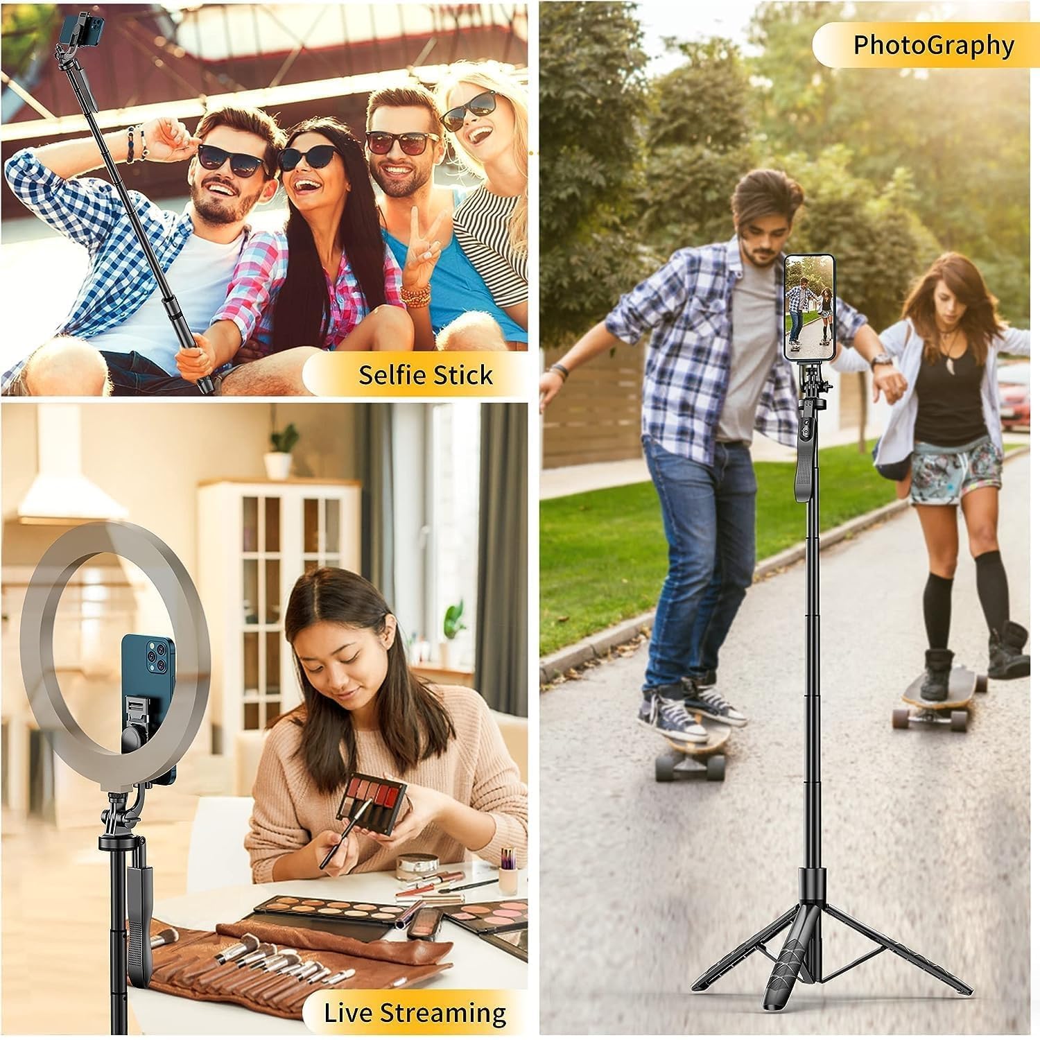 • Our long selfie stick is both compact and travel-friendly. Once folded, it’s only 12 inches long, making it easy to pack in your bag or backpack without taking up too much space. This tripod is a perfect choice for traveling, hiking, and camping.