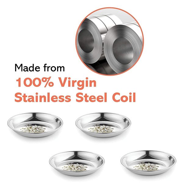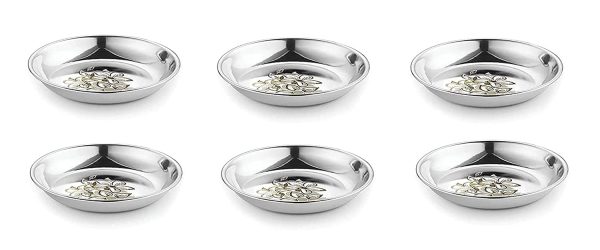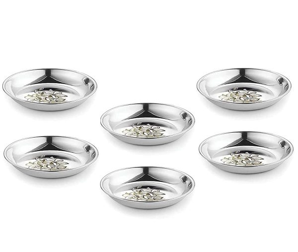- SK 360 World Stainless Steel Halwa Plate / Snacks Plate / Sweet Dish / Ice Cream Vati / Dessert Dish Heavy Gauge with Mirror Finish and Beautiful Permanent Floral Laser Design Set of 6