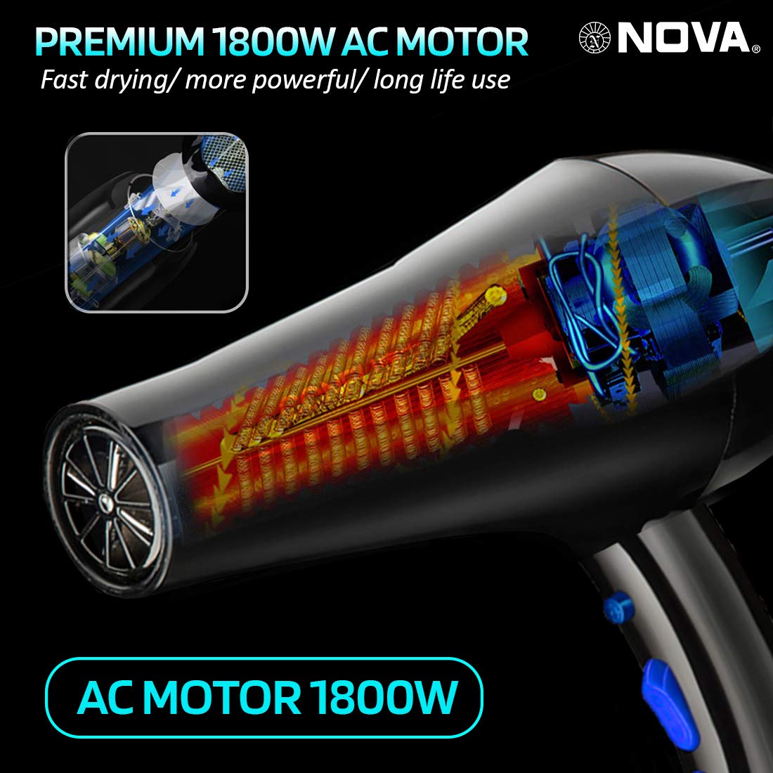 Nova NHP 8211 1800 Watts Proffesional Hair Dryer for Women (Blue)