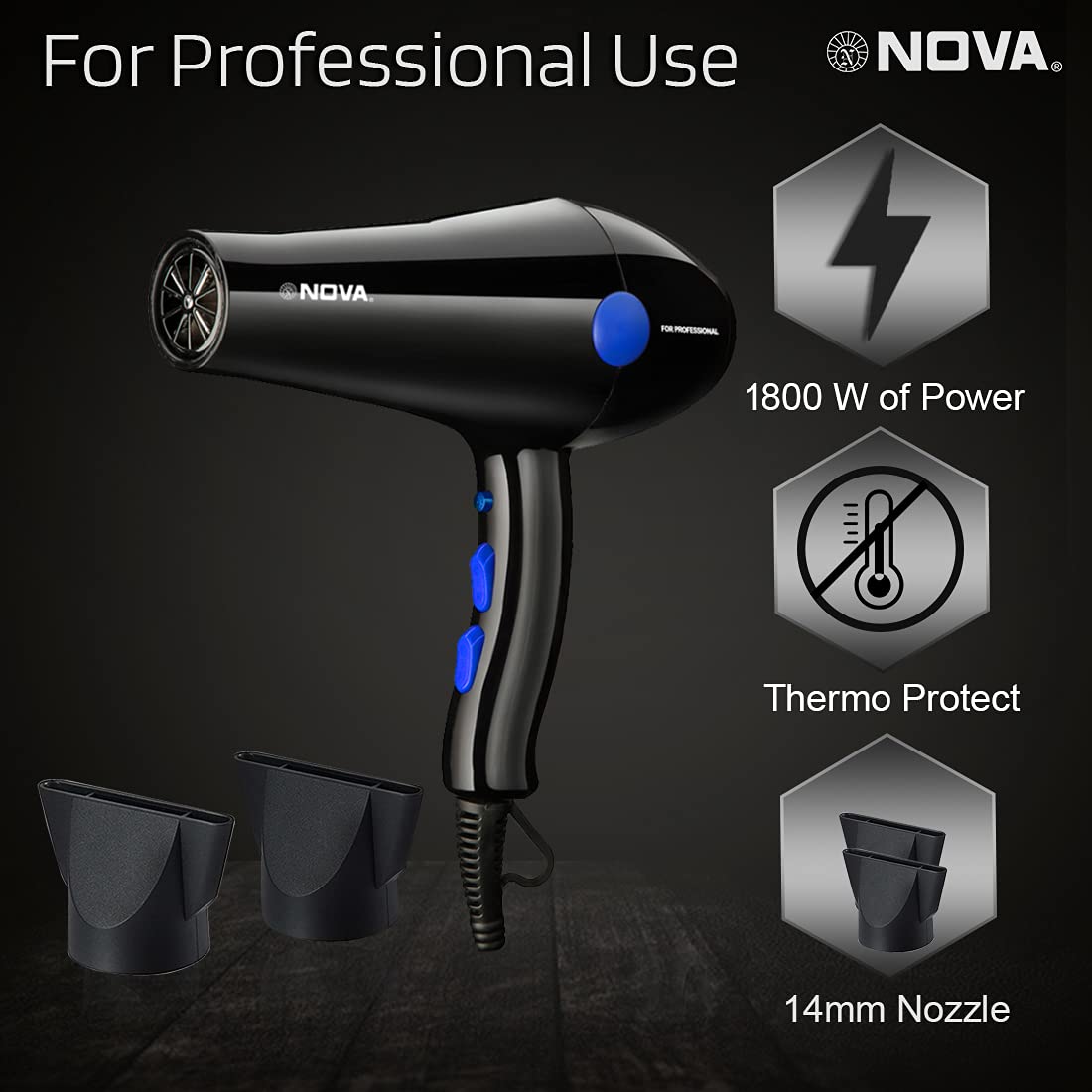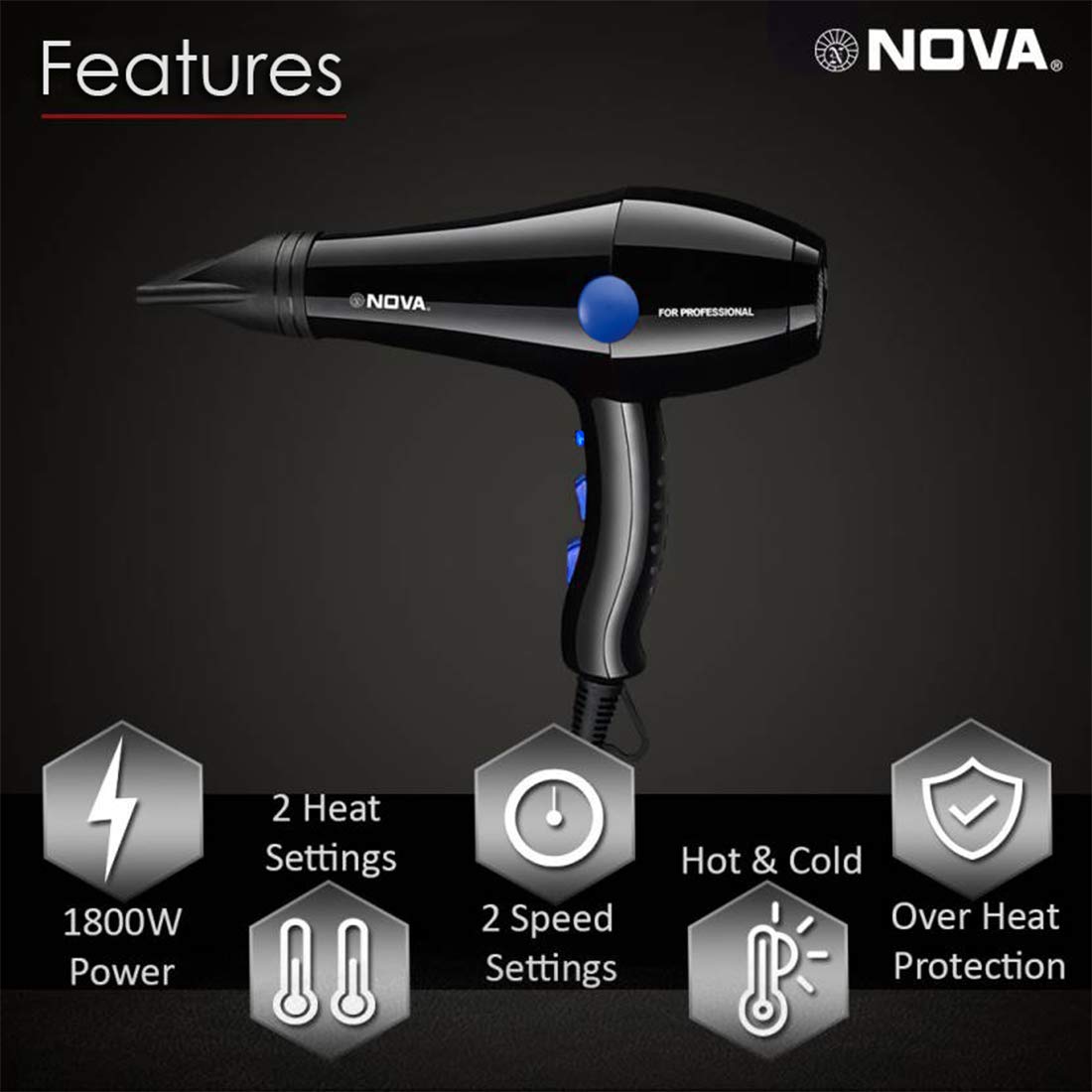 Details: Introducing Nova Professional Dryer with 1800 watts of powerful drying , so that you can get salon-like hair styling even at your home . This hair dryer features Advanced Ehd + Technology which ensures that only the right amount of heat is distributed on your hair and preventing any damage to your hair. The Shine and condition Techonlogy ensures that you hair is always silky and smooth. The Thermo protect temperature setting in this dryer also provides shine and conditions your hair, so that you have a Gorgeous looking hair style.