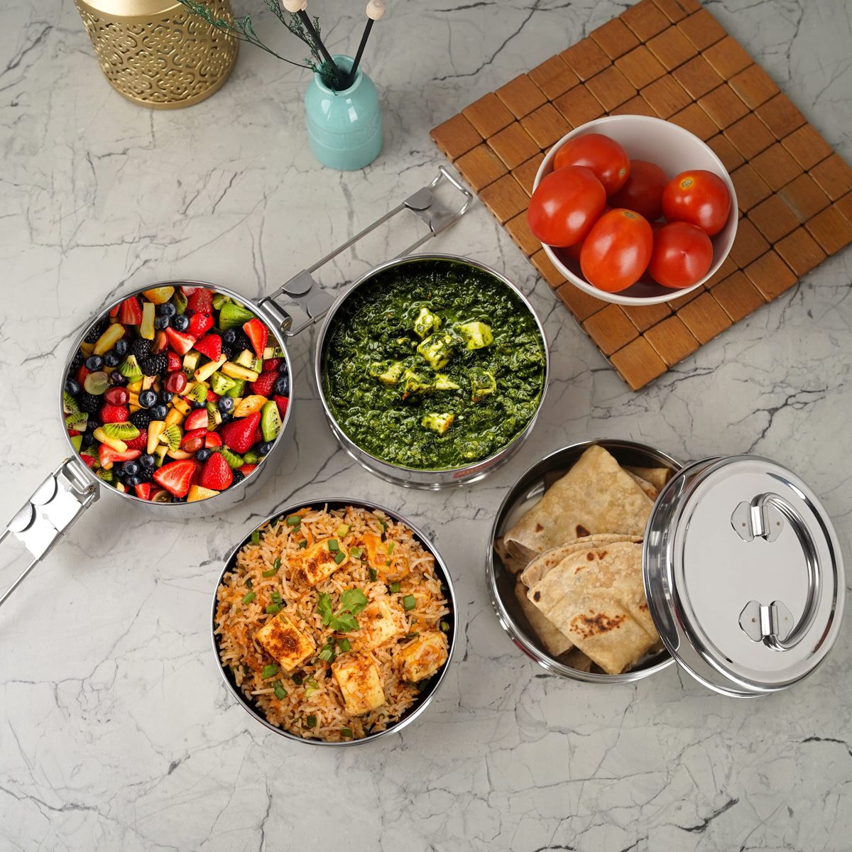 - Pack contents 1 Tiffin box with 4 containers: 13 X 13 X 19 (Cm), Capacity – 2550ml: Weight – 670gms