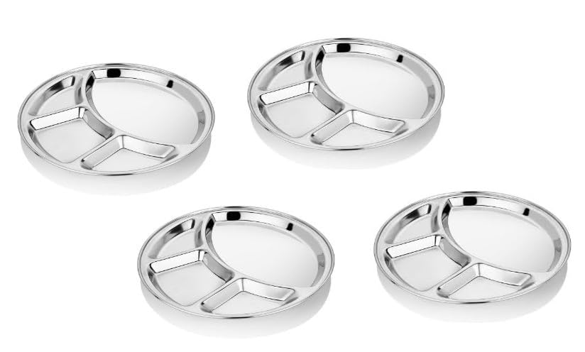 • 4 Deeply compartments make it an ideal plate for lunch & dinner and can be used in Home, Office, & Canteen, It is easy to use and clean, dishwasher safe, rust-proof, Spill proof. This compartment plates / thail will not retain or impart colors, stains, odors, or flavors.