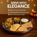 - Hammered Finish – The unique hammered finish on the Essentials thali set stainless steel plate adds a touch of elegance to your dinner table, making it perfect for both everyday use and special occasions.