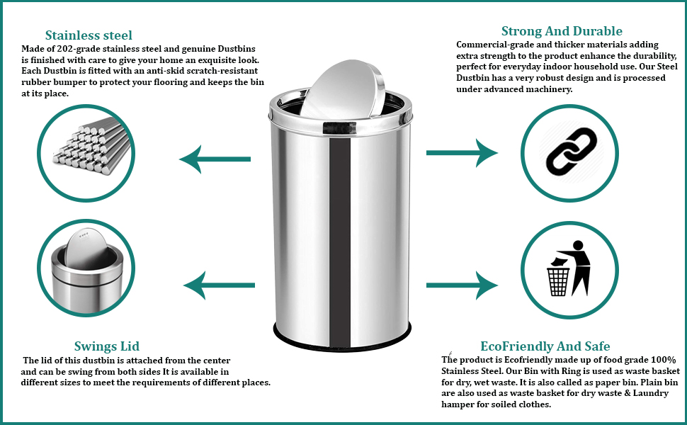 - Our dustbin is built to last, thanks to its sturdy stainless steel construction. It resists dents, scratches, and corrosion, ensuring long-term durability and easy maintenance.