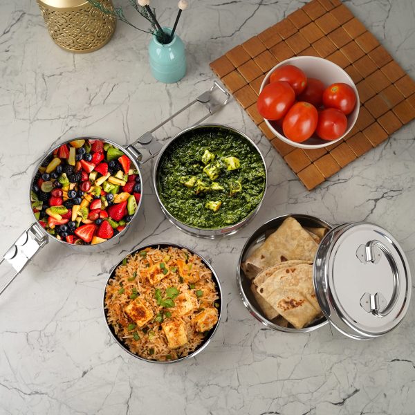 - This Stainless-Steel Round Tiffin comes with Flat and Sturdy base. This Clip Tiffin box is made from good quality food grade stainless steel, which makes it Durable and Strong.